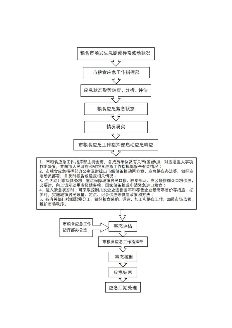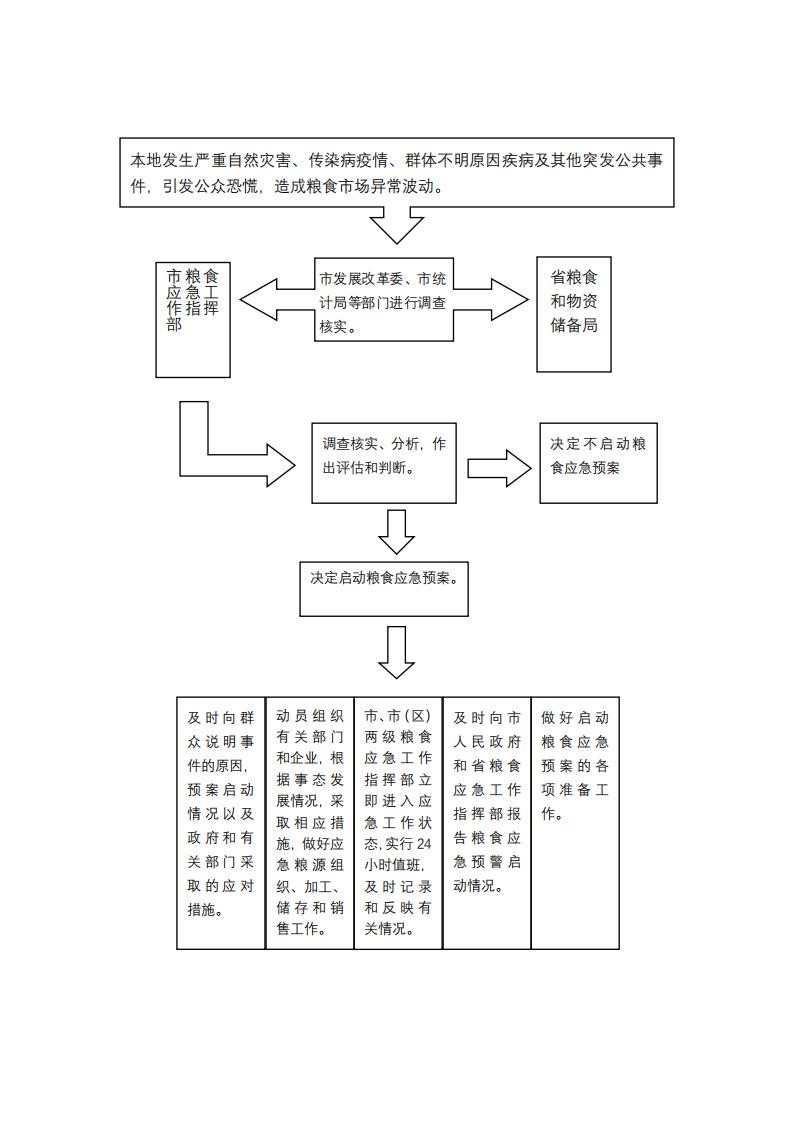 (二)各有关部门按照职能分工,及时采取应急措施,做好粮食采购、调运、加工和供应工作,加强市场监管,维护市场秩序。